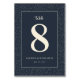 This elegant wedding table card features a sophisticated dark navy background adorned with subtle white dots, creating a modern and minimalist aesthetic. The design highlights a large cream-colored number "8" at the center, framed by clean lines and ample negative space for a refined look. Above the numeral, the word "table" is elegantly scripted in cursive, while below it, customizable names and dates can be added in a simple serif font. The overall mood is one of understated elegance, perfect for adding a touch of class to your wedding reception seating arrangement.
