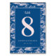 This is a classic style image featuring an elegant table number card for Lauren & Benjamin's wedding on May 23, 2026. The deep blue background is adorned with intricate white floral patterns that create a sophisticated and timeless look. At the center, the large, bold number "8" stands out in pristine white, surrounded by the names of the couple in a delicate script font. It exudes a sense of refined elegance and celebration, perfect for setting the tone at a formal event.