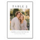 This is a minimalist style image featuring a charming couple, Isabella and Patrick, on their wedding day. The photograph captures them in a warm embrace amidst lush greenery, bathed in the soft golden light of late afternoon. Their joyful expressions and casual elegance exude love and happiness. The card includes "TABLE 2" at the top with their names and wedding date below, making it perfect for guiding guests to their seats while adding a personal touch to the event decor.
