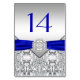 Cartões de mesa de casamento azul royal prata diamante elegantes. Você pode adicionar o número e escolher o estilo, tamanho e cor da fonte neste lindo cartão de mesa azul royal.