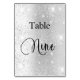 O número da tabela é escrito com um script de estilo elegante com letra manual. Letras negras, um fundo de prata sujo com poeira brilhante falsa, faíscas.