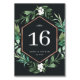 Os cartões botânicos de mesa de inverno chic apresentam uma falsa borda geométrica de cobre cercada por folhagem botânica de cor aquosa verde e pequenas flores brancas, sobre um fundo rico e preto. Projetado para coordenar com a nossa coleção de artigos de casamentos com a Estufa. NOTA: as placas de números de tabela devem ser personalizadas individualmente e adicionadas ao carrinho um por um.
