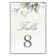 Bela numeração de mesa de casamento com eucalipto aquarela e folhas douradas.