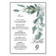 O design apresenta uma ramificação elegante de eucalipto que agrupa o número da tabela e o menu.