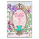 Esta carta de número de mesa de festas encantadora apresenta um tema colorido de um conto de fadas arco-íris. Uma grande estrutura de espelho de ouro é colocada no centro com duas fadas bonitinhas girando ao seu redor. Um dragão roxo é colocado no canto superior esquerdo e uma princesa de lá está sentada no fundo do espelho. A cena química apresenta sotaques de brilho colorido e dourado, elementos do estilo folha de ouro e luzes de fada colocadas ao redor da borda.