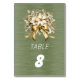 Cartão de número de mesa na bela coleção de flores de inverno branco, folhas verdes e design de fita dourada.