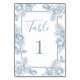 Esses Sinais de Número de Mesa de Noivado Florais Elegantes em Azul Empoeirado são elegantes, modernos, chiques e charmosos - perfeitos para um casamento de jardim, botânico, rústico, romântico, floral, formal ou vintage. A combinação requintada de rosas azuis empoeiradas graciosas e folhagens finas é fluida, delicada e bonita. O design monocromático é impressionante e clássico.