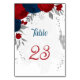 Vermelho escuro romântico e flores azuis marinhos com folhas prateadas cartão de número da mesa de casamento botânica. Os detalhes de brilho são simulados.