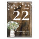 A design desta placa de número da mesa de casamento apresenta uma prancha russa, mas suave e elegante de madeira dura, com delicada estrutura branca, tipografia branca para os detalhes do casamento alinhados à direita da carta e decorada com cordas de luz penduradas e um belo buquê rústico de flores brancas. Para este pano de fundo, obrigado-te a Patrick Fore da Unsplash.