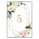 Número da Mesa de Flores Geométricas de Primavera em Aquarela | Número de mesa elegante e feminino com ilustrações em aquarela de rosas e peônias brancas, pêssegos e rosas, acentos de folhagem e moldura geométrica em folha falsa. Este número de mesa floral é perfeito para eventos de primavera e jardim.