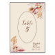 Lindas flores secas, grama de pampas, folhas de palmeira, trigo, folhas secas e cartão de número de mesa de bagas.