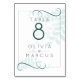 Número da Tabela de Casamento | Folhas de cor branca e clara, cor de menta, por detrás do texto, com uma fina estrutura e espirais em verde-jade para sotaque - Isto é parte de uma suite de casamento coordenada.