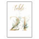 Linda carta de número de mesa com um motivo botânico - uma ilustração de aquarela de folhas verdes e douradas. Mesa 21. Por favor, verifique todos os números disponíveis