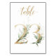 Linda carta de número de mesa com um motivo botânico - uma ilustração de aquarela de folhas verdes e douradas. Mesa 23. Por favor, verifique todos os números disponíveis