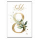 Linda cartão de número de mesa com um motivo botânico - uma ilustração de aquarela de folhas verdes e douradas. Mesa 8. Por favor, verifique todos os números disponíveis
