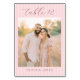 Este cartão de mesa de casamento apresenta um design romântico e elegante com um fundo rosa pastel suave adornado com listras verticais sutis. O layout inclui um grande espaço para foto de duas pessoas em um ambiente ao ar livre, cercadas por gramíneas altas durante o pôr do sol ou o nascer do sol, criando uma atmosfera quente e convidativa. O texto "mesa 12" é exibido de forma elegante em letra cursiva no topo, enquanto os nomes são apresentados em fonte serifada em negrito na parte inferior, ambos em uma cor mauve profunda que contrasta lindamente com o fundo claro. O clima geral é de calor e celebração, tornando-o perfeito para eventos formais.
