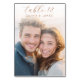 Este cartão de mesa de casamento apresenta uma fotografia calorosa e íntima de dois indivíduos com iluminação suave e dourada que cria um clima alegre e afetuoso. O design utiliza uma fonte elegante em script para "mesa 12" seguida por letras maiúsculas estruturadas para os nomes, adicionando um toque de formalidade ao sentimento natural. A paleta de cores inclui azuis e brancos suaves em suas roupas, contrastando lindamente com os tons quentes do fundo. Perfeito para criar uma atmosfera pessoal e convidativa em seu evento especial, este cartão captura expressões e emoções genuínas, tornando-o ideal para celebrar o amor e a conexão.