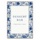 Este elegante sinal de mesa para casamento apresenta uma paleta de cores clássica em azul e creme, com um padrão floral simétrico que cerca o espaço branco central. O design exibe peônias e folhagens detalhadas em um estilo de porcelana vintage, criando um visual charmoso e sofisticado. Uma tipografia serifada maiúscula e ousada anuncia "DESSERT BAR" seguida por uma mensagem convidativa aos convidados. Perfeito para adicionar um toque de elegância e alegria à sua mesa de sobremesas, este sinal estimula a interação com seu tom amigável.