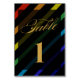 Display table assignments with these elegant gay wedding table number cards. Bold diagonal rainbow stripes on black with luxurious gold typography showcase table numbers beautifully at your reception. Fully customizable with numbers or custom table names that reflect your style. The sophisticated design stands prominently on tables, helping guests find their seats easily while adding a polished finishing touch to your tablescape. Coordinates seamlessly with our complete Gay Men Wedding Collection. Ideal for contemporary LGBTQ celebrations seeking personalized, stylish wedding reception decor.