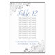 Essas lindas placas de números de tabela apresentam um design simples, mas elegante, com a caligrafia de cinza azul-claro em um fundo branco com um filigre floral de folha fina prateada nos cantos. Cada placa tem espaço para os nomes de 10 hóspedes, de modo que eles também funcionam como um fazer de assentos. É fácil para o pessoas encontrar suas mesas na sua recepção de casamento.