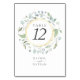 Uma guirlanda decorativa de louro circunda uma borda de folha dourada falsa contendo os números da mesa acima dos nomes do casal feliz. Desenhado por Thisisnotme©