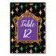 Quer você esteja comemorando o festival de Mardi Gras ou um Chá de panela temático, Festa de solteira, Festa de aniversário ou outra ocasião, este elegante tema design vai vestir sua mesa em jazzy, estilo Mardi Gras. Apresenta alicerces, máscaras, miçangas e símbolos de flur de lis dispostos em um plano de fundo padronizado em preto (a cor pode ser alterada por "personalizar") e um traçado de tom de ouro elaborado em volta de um fundo roxo para realçar os números de suas tabelas. Design composto por Holiday Hearts Design (direitos reservados).