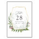 Cartões de número de mesa para casamento com folhagem da floresta com ervas silvestres, samambaias e folhas com moldura geométrica dourada personalizável para os detalhes do seu evento.