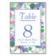 Quer as mais recentes cores do casamento? Essas lindas e aquáticas hibrines são uma mistura de violeta púrpura a lavanda, verde, escuro e rosa claro, e azul escuro e claro. Enrolam à volta do cartão de número da mesa com vários tons de folhagem verde. Olhem bem, cada cabeça colorida foi criada à mão e é uma peça de arte muito singular.