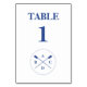 Um cartão de número de tabela inteligente em azul profundo em um fundo branco para remadores de keen. Prepare uma placa de mesa separada para cada número necessário. O cartão tem um 'logotipo' redondo que mostra remos cruzados com um círculo duplo 'costura' com espaço para você entrar em quatro iniciais. O verso da carta tem uma imagem de água suavemente ondulada, para manter o tema do remar.