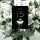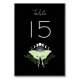 Uma mariposa verde vibrante é cercada por fases na lua e lama folhas verdes em um fundo preto profundo.