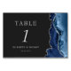 A borda direita desta elegante e moderna placa de número da mesa de casamento apresenta uma marinho azul de aquarela agata bordada com falso brilho prateado. O texto personalizável combina fontes de serif romana de cinza prateada, itálico e de chapa em um fundo preto de ardósia.