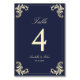 O marinho elegante, cartão de noiva barroco, azul e ouro, perfeito para guiar hóspedes aos seus assentos na sua recepção. Projetado com ouro ornamentado floresce e detalhes personalizáveis, este número de tabela é ideal para casamentos formais, de luxo e clássicos. Coordena-se com a suíte de convite para casamento marinho azul e barroco-ouro para um olhar coeso.
