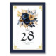 Elevem a vossa decoração de casamento com este elegante cartão azul de marinho e de mesa floral de ouro. Apresentando sofisticados sofisticados sotaques florais azuis e dourados e tipografia clássica, este cartão numérico da tabela adiciona um toque luxuoso às suas mesas de recepção. Personalize-o com os nomes dos casais e a data do casamento para um olhar maravilhosamente coordenado que melhora o seu elegante tema do casamento.