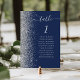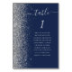 A borda esquerda desta elegante e moderna placa de número da mesa de casamento apresenta uma borda cintilante de falso prateado. A palavra "mesa" aparece em cinza prateada, escrita à mão, num fundo azul marinho. Adicione os nomes dos seus convidados que estão atribuídos a cada mesa.
