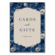 Este elegante sinal de mesa para casamento apresenta um sofisticado fundo azul-marinho adornado com um padrão repetitivo de rosas brancas detalhadas e folhagens verdes, criando um visual clássico e atemporal. A moldura central é de uma cor creme esbranquiçada, proporcionando um fundo limpo para a tipografia serifada em negrito que lê "Cartões e Presentes" seguido por "Obrigado", transmitindo gratidão de forma refinada. O layout equilibrado e o design harmonioso tornam-no perfeito para expressar apreço em seu evento especial.