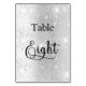 O número da tabela é escrito com um script de estilo elegante com letra manual. Letras negras, um fundo de prata sujo com poeira brilhante falsa, faíscas.