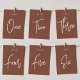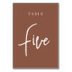 Cartões simples e chic em tons de terra, marrom e branco, fazem uma declaração elegante no seu casamento ou evento. Design apresenta "mesa [number]" em uma combinação de olhares de serif clássica e de caracteres de script manuscritos. Design repete-se de ambos os lados. Cartões numerados individualmente vendidos separadamente; solicite cada número de tabela individualmente da nossa coleção.