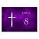 Esta é uma carta de mesa elegante com uma bonito cruz prateada e texto sobre um abstrato roxo brilhante. A parte traseira da placa é idêntica à da frente. Todo o texto pode ser facilmente personalizado. Este cartão combina com o Purple Silver Christian Cross Wedding Invtions" em minha loja, mas é apropriado para uma variedade de ocasiões de janta formal. Se você quiser adicionar os dois corações prateados no pé da cruz (como nos convites de casamento correspondentes), basta nos enviar uma solicitação de e-mail e ficaremos felizes em adicioná-los para você.