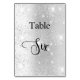 O número da tabela é escrito com um script de estilo elegante com letra manual. Letras negras, um fundo de prata sujo com poeira brilhante falsa, faíscas.