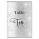 O número da tabela é escrito com um script de estilo elegante com letra manual. Letras negras, um fundo de prata sujo com poeira brilhante falsa, faíscas.