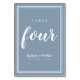 Este design foi criado para celebrações de casamento íntimas e menores. Simples, minimalista e elegante, o design do Número da Mesa de Casamento QUATRO apresenta um design contemporâneo com uma borda de quadro duplo em branco crocante sobre um fundo azul empoeirado. O design sofisticado e elegante fornece sofisticação moderna e atemporal. Personalize o design da mesa de casamento com os detalhes do seu casamento em letras brancas nítidas e caligrafia. O verso do cartão é uma duplicata da frente. Peça um para cada mesa com os números individuais das mesas.