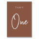 Cartões simples e chic em tons de terra, marrom e branco, fazem uma declaração elegante no seu casamento ou evento. Design apresenta "mesa [number]" em uma combinação de olhares de serif clássica e de caracteres de script manuscritos. Design repete-se de ambos os lados. Cartões numerados individualmente vendidos separadamente; solicite cada número de tabela individualmente da nossa coleção.