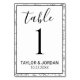 The typography prominently features the word "Table" in a graceful, flowing modern script, paired with a clear and bold numeral for easy visibility across the room. Below the table number, you can easily personalize the card with the names of the couple and your wedding date in a timeless sans-serif font. Its classic monochrome palette makes it a versatile choice for any venue, from an urban loft to a garden estate.