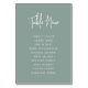 Cartões simples e chic em Eucalyptus Green e White fazem uma declaração elegante no seu casamento ou evento. Design apresenta "mesa [número]" em letra de script manuscrita, com nomes de convidado individuais abaixo na tipografia da serif do eterno. Design repete-se de ambos os lados.