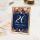 Cartões românticos russos de números de mesas de casamento apresentam um monograma na moda com números moldados por um arranjo floral de aquarelas com belos rosas, dahlias, flores de pénia e verde, em uma bela paleta de outono de vermelho-burgundy, amarelo-ouro, laranja-pânquio, rosa-pincel e tons de verde. Cor de fundo azul rica do marinho.