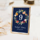 Cartões românticos russos de números de mesas de casamento apresentam um monograma na moda com números moldados por uma coroa floral de cor d'água com belos rosas, dahlias, flores de pénia, e verde, em uma linda paleta de outono de vermelho arrojado, amarelo ouro, laranja cor de pêssego, rosa pincelado e tons de verde. Cor de fundo azul rica do marinho.
