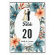 Este número de mesa de casamento floral aquarela é perfeito para um casamento moderno. O design romântico apresenta uma moldura floral aquarela elegante com uma ilustração de noiva e noivo e caligrafia preta em um fundo branco.