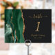 A borda esquerda deste cartão de número de mesa de casamento moderno e elegante apresenta uma borda de ágata em aquarela verde esmeralda aparada com brilho dourado falso. O texto personalizável combina escrita à mão dourada, fontes itálicas e copperplate em um fundo preto claro.