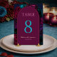 Tom de mesa de casamento elegante e sofisticado com flores em tons de joias burgundy. Adicione um toque de sofisticação às mesas do seu casamento com este sinal de número de mesa floral em tons de joias chic e elegante. Com uma impressionante disposição de flores ricas em burgundy, azul-marinho, fúcsia, magenta, turquesa e roxo, este design melhora sem esforço a decoração do seu casamento. Perfeito para guiar os convidados aos seus lugares com estilo, este sinal de número de mesa combina elegância moderna com uma estética floral vibrante, tornando-o uma bela adição à recepção do seu casamento.