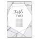 Este design apresenta padrões elegantes de mármore e geometria. Os padrões geométricos sobrepõem as linhas naturais simples do mármore. A combinação de cinzas, preto e branco cria um estilo sofisticado, moderno e chic. Elegante design da mesa de casamento com elementos modernos. A configuração moderna da tipografia lhe dá um estilo distinto. Os convites de casamento e outros artigos de papelaria também estão disponíveis. Personalize o número e adquira cada número mesa individualmente de acordo com quantos números de tabela você precisa.